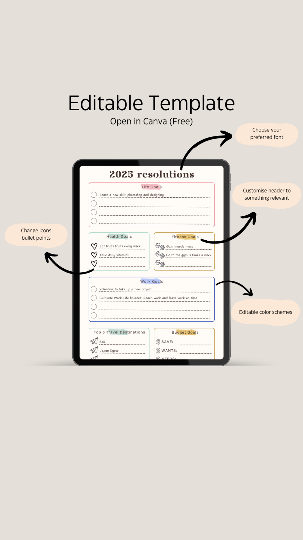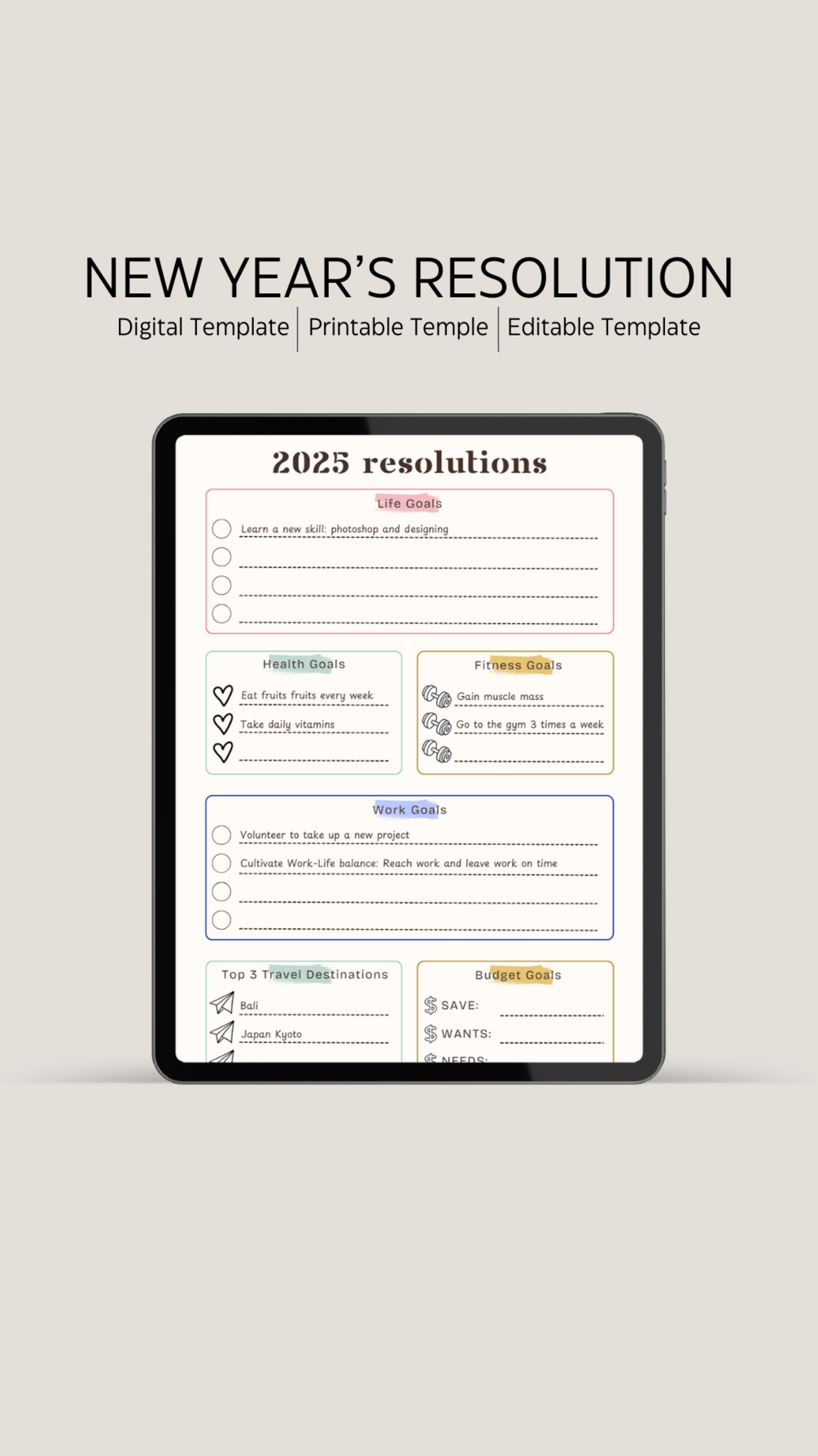 Kickstart your New Year with this customizable Resolution Template! From work and life goals to health, fitness, and budgeting, it’s your ultimate guide to staying on track. Plus, plan your top 3 travel adventures for the year! Fun, organized, and totally tailored to YOU—let's make this year your best one yet!
